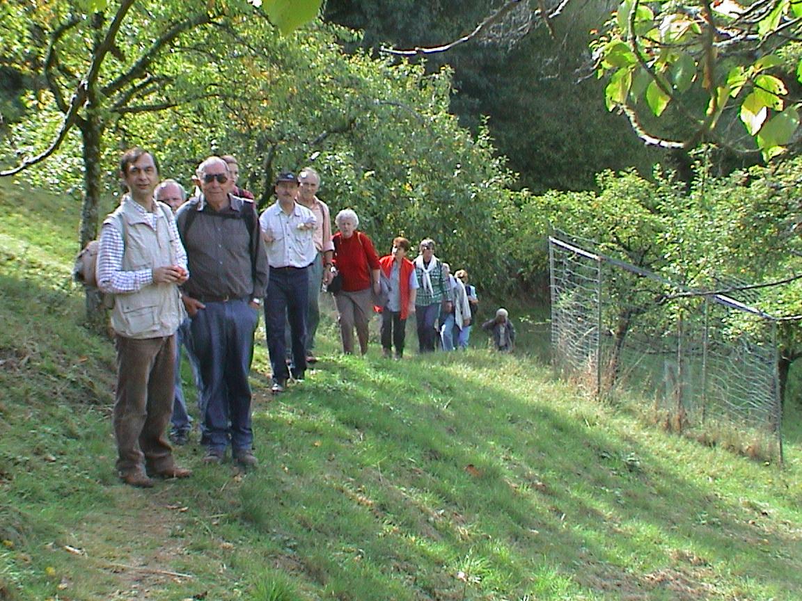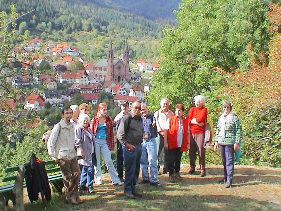 Tour 2003 ins MurgtalGewandert am Freitag, den 3.10.2003 mit 14 Teilnehmern, ca. 8 km. Zunächst ging es etwas talaufwärts, um dann auf schmalen Pfaden etwas Höhe zu gewinnen, gerade genug, um einen herrlichen Blick auf Forbach genießen zu können. Daran vorbei ging es dann in den Nachbarort Gausbach, wo auch der Ausklang im Landgasthof Waldhorn stattfand. Anfahrt mit dem Regional-Express, der um 11:14 aus dem Karlsruher Hauptbahnhof abfuhr und um 12 Forbach erreichte. Rückfahrt um 17:11 mit der Stadtbahn. Die Strecke: Aus dem Bahnhof Forbach heraus kommend ging es zunächst nach links die Straße entlang, die kurz danach hinunter zur alten Holzbrücke über die Murg führte, Forbachs Wahrzeichen. Diese nutzten wir zur Murgquerung. Die erste Straße, die nicht nur eine größere Hofeinfahrt war, bogen wir nach links ab. Dieser folgen wir bis fast zum Ende. Ein Hinweisschild zur Bundesstraße und glaub auch zum Wanderweg weist uns an, den weiteren Weg durch die Häuser durch zu suchen. Man sollte nicht gleich die Bundesstraße ansteuern, sondern einen Blick auf die Anlagen des Kraftwerks werfen. Irgendwo soll auch ein Strommuseum sein, das aber wohl gerade neu konzipiert wurde. So sagte es mir eine Webseite, die ich auf der Suche nach einem Regenprogramm ergoogelte...