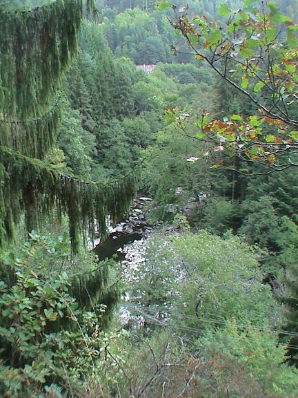 Oben an der Bundesstraße angekommen folgten wir kurz dem Fußweg entlang der Straße talauf- und ortsauswärts. An dessem Ende querten wir die Straße, um den schmalen Pfad bergauwärts zu erreichen. Dieser Weg führt etwas oberhalb der Straße talaufwärts. Wir orientierten uns ab hier an den Schildern zum Murgübergang Heppenau. Auf der amtlichen TK 1:50.000 fehlt der Weg tw. bzw. ist tw. kaum zu erkennen. Kurz nachdem der schmale Pfad in einen breiteren Weg mündet, überbrückten wir die Rohre von der Schwarzenbachtalsperre zum Kraftwerk. Ab Holdereck (Restaurant und Bushaltestelle) liefen wir ein Stückchen auf dem Weg, der auch zum Naturfreundehaus führt. Relativ bald zweigt dieser Weg weiter nach oben ab. Unser Weg führte weiter tal- und leicht bergaufwärts, bis kurz nach einer schärferen Rechtskurve mit Leitplanke ein schmaler, grasbewachsener Pfad nach unten abzweigte. Dieser Weg führte wieder zur Bundesstraße, die, etwas ungünstig in einer Kurve gelegen, überquert werden musste. Auf der anderen Seite liegt ein Parkplatz, von dem ein Weg abzweigt, der uns weiter nach unten führte, bis er eine Hütte erreichte, in dessen Nähe uns dann eine kleine Brücke das Queren der Murg ermöglichte. Auf der anderen Seite führt ein Weg rauf zum Fernradweg durch das Murgtal, dem wir, nach links abbiegend, eine Weile folgten. Nach dem Forsthaus an der nächsten Gabelung bogen wir nach links ab, weiter in Richtung Forbach. Von diesem Weg zweigt nach einer Weile ein schmaler Pfad nach rechts ab, markiert mit der blauen Raute mit weißem Strich des Schwarzwaldvereins. Dieser führt steinig aufwärts, bis wir oberhalb der Felsen ins Murgtal zurück schauen können. An der nächsten Gabelung geht es nach rechts noch ein kurzes Stückchen aufwärts, bis wir an einem Strommast einen Aussichtspunkt in die andere Talrichtung mit Bank erreichen.