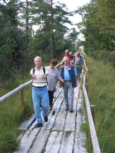 Tour 2005 Kaltenbronn - Bad WildbadGewandert am Samstag, den 24.9.2005 mit 15 Teilnehmern, ca. 11 km. Die Wanderstrecke war rund 11 km lang, hat aber trotz Schwarzwald nur geringe Höhenunterschiede! Kaltenbronn erreichten wir via Murgtalbahn und Bus, den wir schon an der Bushaltestelle Schwarzmißhütte verlassen. Wir querten am Schwarzmiß-Parkplatz die Straße, nahmen den dortigen Weg und bogen bei nächster Gelegenheit rechts ab. Nach Querung des markierten "Mittelweges" der nächste ordentliche Wanderweg links führt geradewegs in Richtung Wildsee. An diesem vorbei sind Grünhütte und danach Sommerberg ausgeschildert. Nach gut der halben Strecke haben wir in der Grünhütte eine Pause einlegt. Laut gruenhuette.de warten einfache Gerichte wie Linseneintopf, Maultaschen, Kesselfleisch, Pfannkuchen, Kuchen und Schlachtplatte auf die Wanderer. Am Ziel hat uns die Sommerbergbahn den Abstieg erleichtert und durch das Enztal fuhren wir heim. Je nachdem, wann man in Bad Wildbad ankommt, gibt es vielleicht auch noch die Möglichkeit, einen kurzen Blick auf den Ort zu werfen, dessen Zentrum mit der Eröffnung der Verlängerung der Enztalbahn umgestaltet wurde.